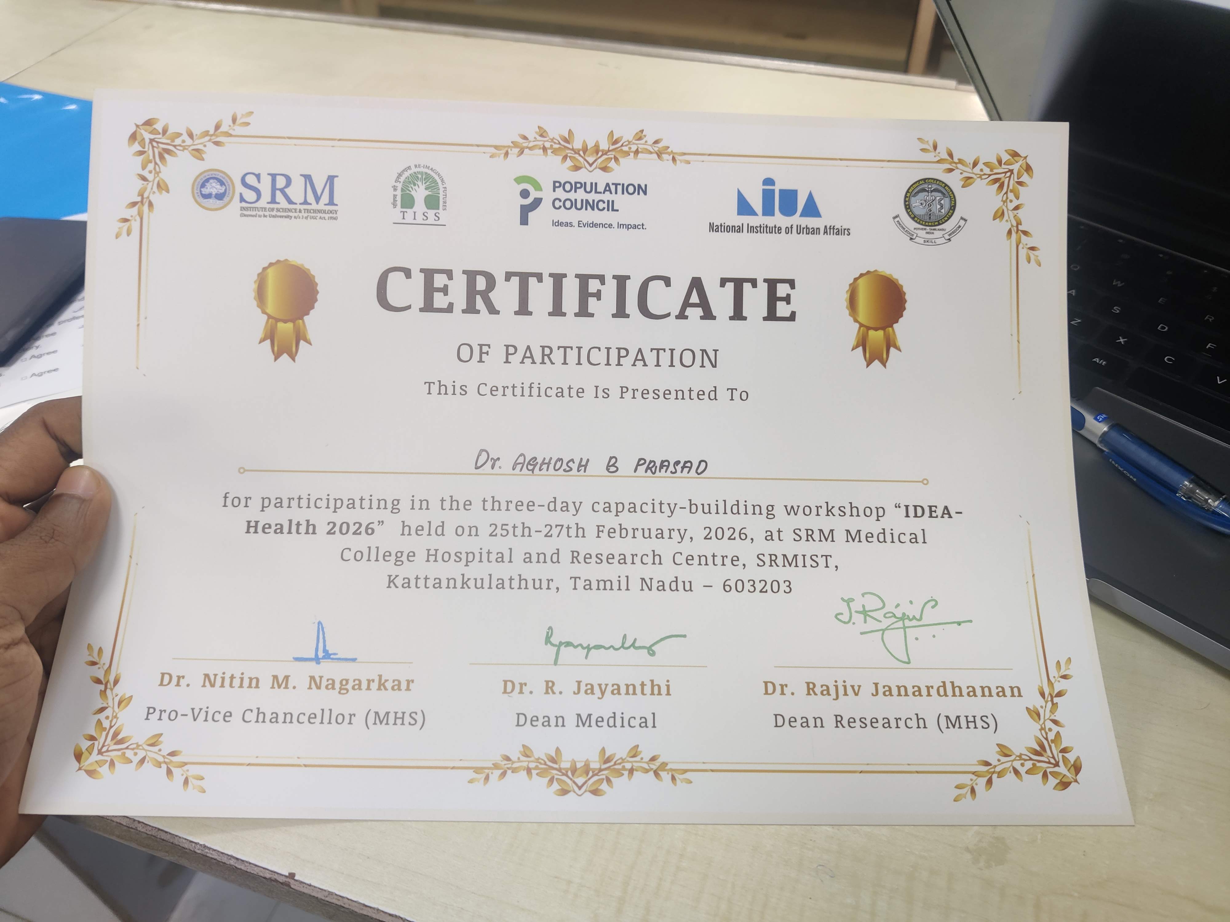 From February 25 to 27, 2026, I had the privilege of attending the IDEA-Health 2026 workshop, organized by the Division of Medical Research at SRM Medical College Hospital & Research Centre. The three-day capacity-building workshop was designed to strengthen foundations in health research by integrating demography, epidemiology, and analytics.